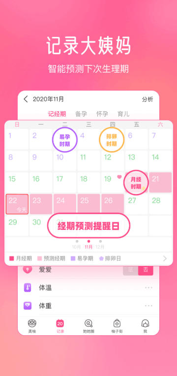 用户可记录月经起止时间、流量及症状,系统基于算法模型自动推算安全期、排卵期及未来6个月经期预测表,周期稳定用户准确率较高。